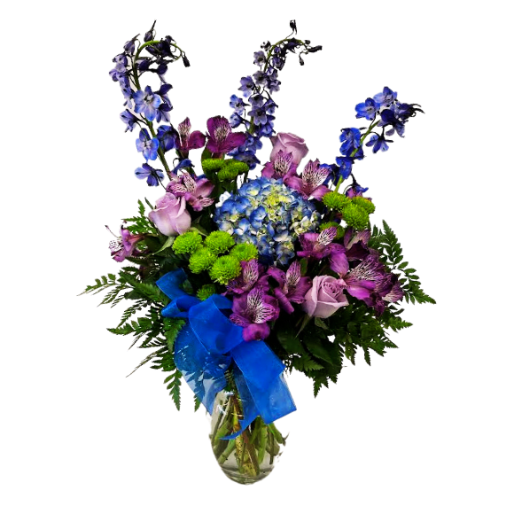 1. Sapphire Skies V-1424: Start the New Year with calm hearts and hopeful dreams. Sapphire Skies V-1424 is the perfect winter flower arrangement to welcome fresh beginnings and peaceful days ahead. Sapphire is a symbol of wisdom, peace, and good fortune, making this arrangement a way to manifest these blessings as the year begins. This arrangement features lavender roses, blue hydrangea, blue delphinium, green athos pom, and purple alstroemeria.