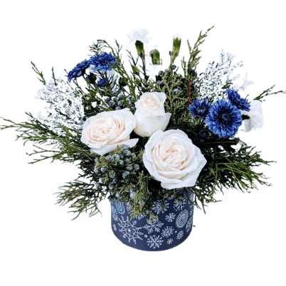 3. Winter Wonderland H-7112: If you're looking for a Christmas flower arrangement that shows the wintery feel of The Polar Express, consider Winter Wonderland H-7112. This arrangement features white roses, blue cushion poms, blue hydrangea, and white alstroemeria, creating a beautiful, cool-toned display that mirrors the enchanting winter landscapes in the movie. The silver-painted Grevillea adds sparkle, while the winter greens bring a fresh element.