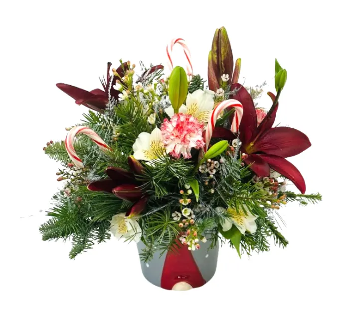 1. I'll Be Gnome For Christmas H-7111: Although elves and gnomes are not the same, the I'll Be Gnome for Christmas H-7111 arrangement is ideal for Elf because it brings the same fun and happy spirit from the movie. The gnome container adds a playful, lighthearted feel, just like Buddy’s personality. The red lilies, peppermint carnations, and white alstroemeria bring bright, Christmas colors, while the fresh evergreens and silver-painted plumosus fern add a wintery look. This arrangement will fill your home with joy and warmth, just like Buddy does in the movie.