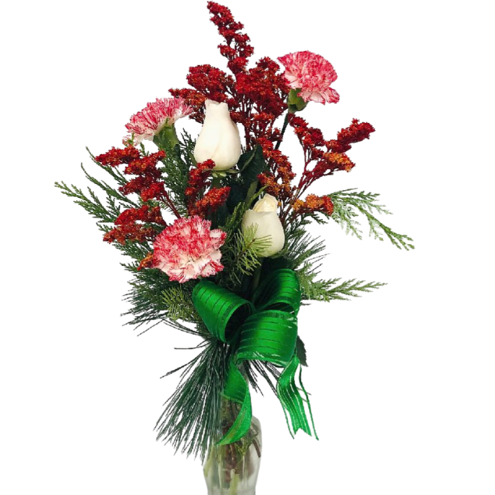 3. Playful Winter Roses in a Bud Vase H-7084: The Playful Winter Roses in a Bud Vase H-7084 is just what you need to introduce a little fun to your holidays. True to its name, "playful," it mirrors the lighthearted spirit of Elf, a movie all about joy, laughter, and spreading happiness. With red solidago, peppermint carnations, and white roses, plus pine and cedar evergreens that offer a fresh, clean scent, this arrangement will make your space feel just right for the season.