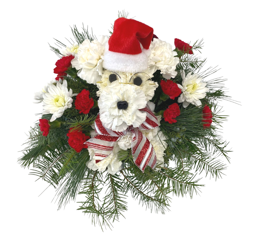 3. Santa Paws H-7033: If we’re talking about good companions, dogs are certainly among them, just like the loyal friends in A Boy Called Christmas. The Santa Paws H-7033 flower arrangement features a cute dog crafted from white carnations, dressed as Santa Claus. Surrounded by lush greens, white poms, and vibrant red carnations, this arrangement brings glee to your holiday celebrations, just like the loyalty and adventure of the characters in the story.