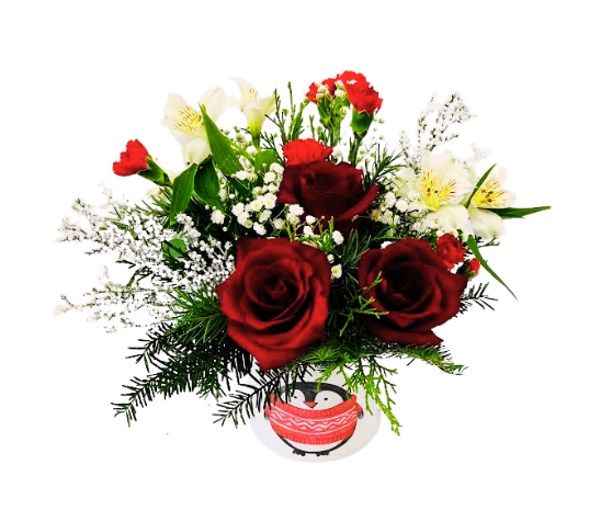 1. Winter Waddle H-7108: For that friend who never fails to make you happy, for the ray of sunshine in your life, the Winter Waddle H-7108 is the perfect Christmas gift. This adorable arrangement features red roses, white alstroemeria, and red mini carnations, all nestled in a charming penguin ceramic container. With soft baby’s breath, fresh evergreens, and sparkling snow-covered branches, it’s a sweet and meaningful gift that your friend will treasure.