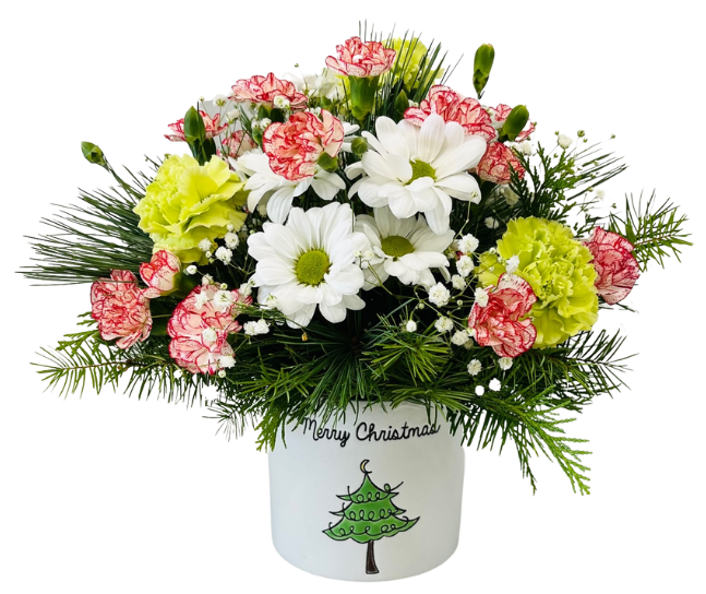 1. Merry Christmas! H-7091: Make your gift straightforward with Merry Christmas! H-7091. This arrangement literally says "Merry Christmas" with its beautiful flowers and statement tin. Featuring winter evergreens, white daisies, green carnations, and peppermint mini carnations, it’s beautifully complemented by soft baby’s breath. All in a keepsake vase. Plus, it is Ideal for Christmas décor.