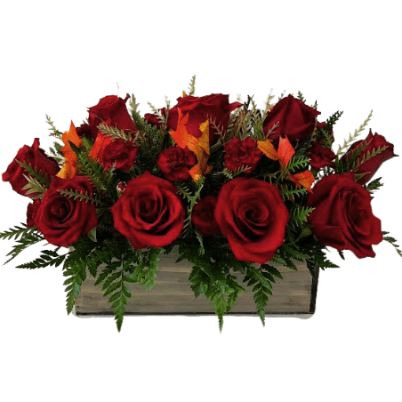 2. Autumn Bakers Dozen (13) Roses R-219: Planning to decorate with the Wine Red Romance theme this year? This arrangement fits it perfectly. The Autumn Bakers Dozen (13) Roses R-219 showcases 13 red roses paired with red mini carnations, creating. Set in a rustic wooden box and accented with preserved oak leaves and lush grevillea, it blends romance with autumn warmth.