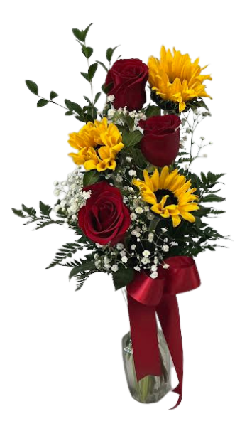 • Roses and Sunshine VM-1387 - Roses and Sunshine VM-1387 is the perfect choice for someone who brings both love and happiness into your life, blending romance and warmth in one thoughtful arrangement. One of our most popular requests, it features six classic red roses paired with six bright sunflowers, accented with yellow solidago and lush greens, all beautifully arranged in a vase. This all-around design makes it an ideal Valentine’s Day gift for someone who loves roses, sunflowers, or both.