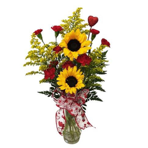 • Sweetheart Mix VM-1438: Sweetheart Mix VM-1438 strikes the perfect balance of fun and sensible. The arrangement includes sunflowers, yellow solidago, and long-lasting red mini carnations, with a Valentine’s bow and red heart, making it an easy-to-love gift for Valentine’s Day.