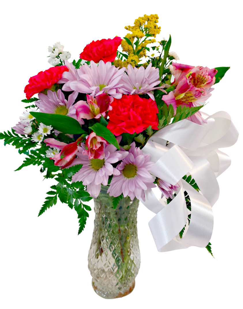• Trinity Garden V-1121: Practical partners often appreciate gifts that are simple, enduring, and uplifting. Trinity Garden V-1121 fits the bill, with solidago, carnations, daisies, and alstroemeria arranged to bring color and natural charm to any room.